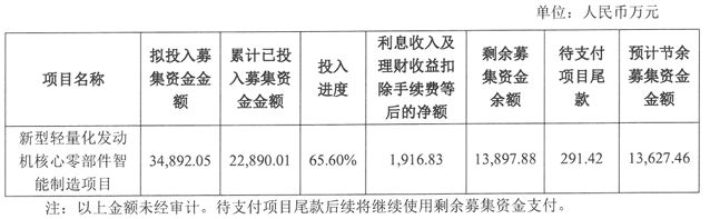 此次拟终止的项目为“新型轻量化发动机核心零部件智能制造项目”(以下简称“新型轻量化项目”),该项目原计划作为公司产能扩张的核心抓手,总投资规模曾高达7.5亿元佳禾资本,其中计划使用募集资金3.49亿元。