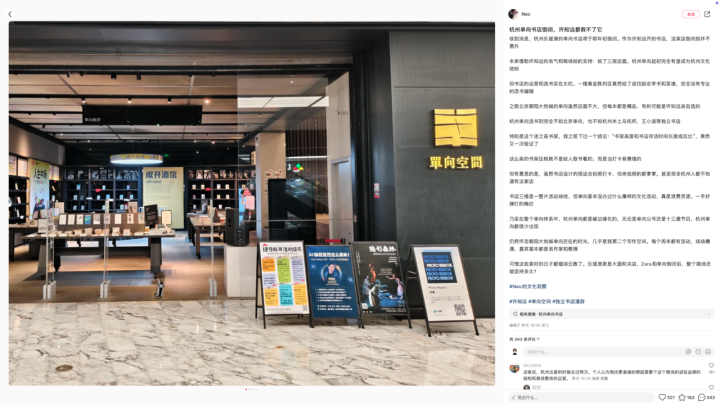 据悉,单向空间杭州乐堤港店于2019年开业,共有三层,营业面积达2800平米,一楼为旅行和经管类的书籍;二楼是人文社科、文学艺术及小众读物,同时有文创产品和咖啡售卖;三楼为付费会员区,同时承接一些小规模的周末分享会。