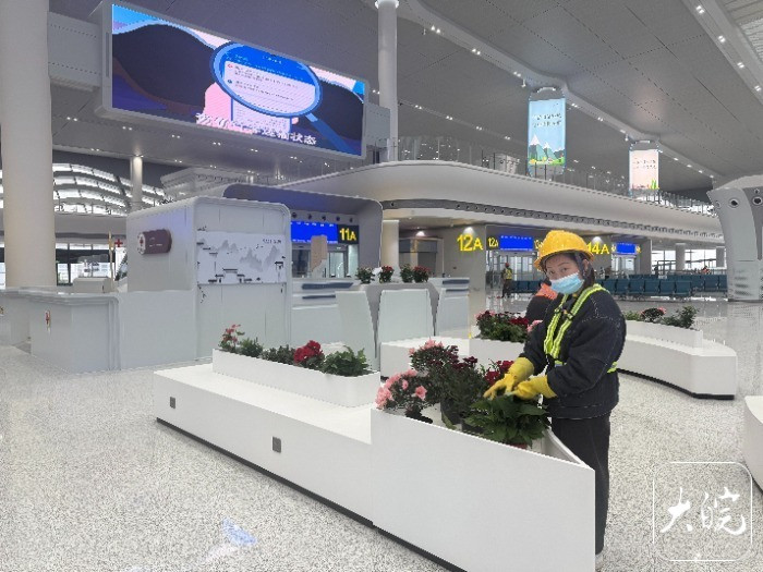 站房以“大湖云帆科技方舟”为设计理念,银白色屋顶线条流畅,“大湖水波”的设计造型已完全呈现。为了迎接月底开通运营,工人们正在紧锣密鼓地进行最后的保洁和装饰收尾工作。