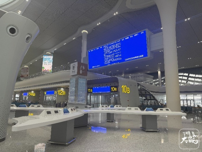 候车大厅内依次分布1到14AB个检票口。记者还注意到,两组检票岛之间的距离被特意拉大至68米。“这是为了避免高峰期多趟列车同时检票时,排队人流相互干扰、拥挤。”方文彬说,拓宽的通道也使得空间更显开阔通透。