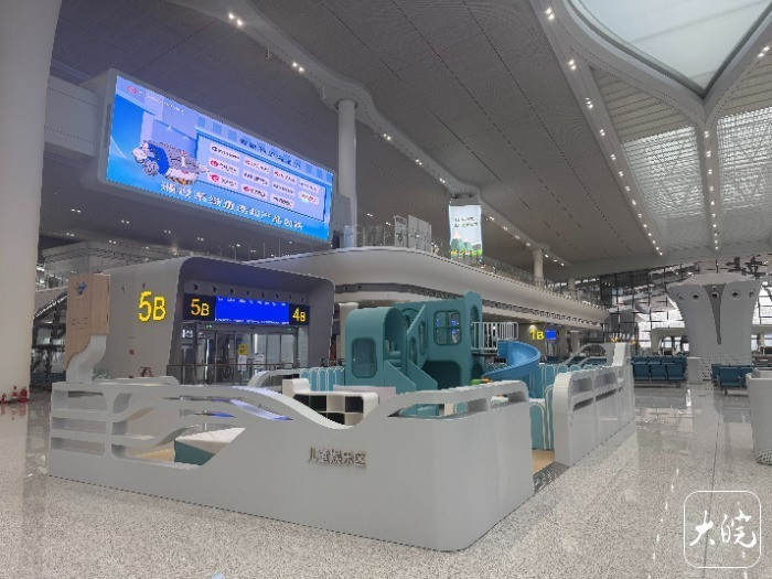 为了方便站内候车的乘客,合肥西站的细节设计非常贴心。记者观察到,候车区设置有“景观座椅”,以岛屿式、流线型组合布置,中间点缀着绿植。一些座椅旁配备了带USB接口的充电吧台和桌面,方便商务旅客办公。专门的儿童娱乐区色彩明快,军人候车区庄重静谧,还特别设置了哺乳室,彰显对不同人群的人文关怀。