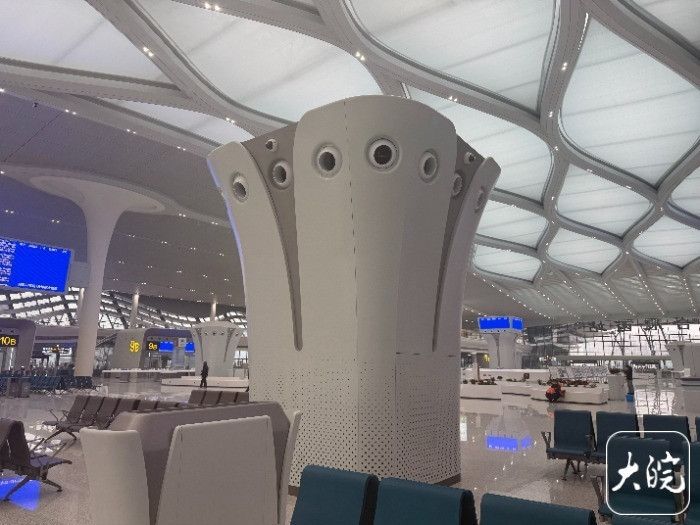 记者注意到,出站层的白色吊顶并非平整一片,而是由无数个方形模块错落有致地拼接而成,形成富有韵律的“智慧矩阵”。据介绍,这种设计灵感源于集成电路芯片,呼应合肥的创新基因。